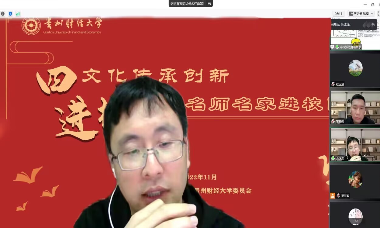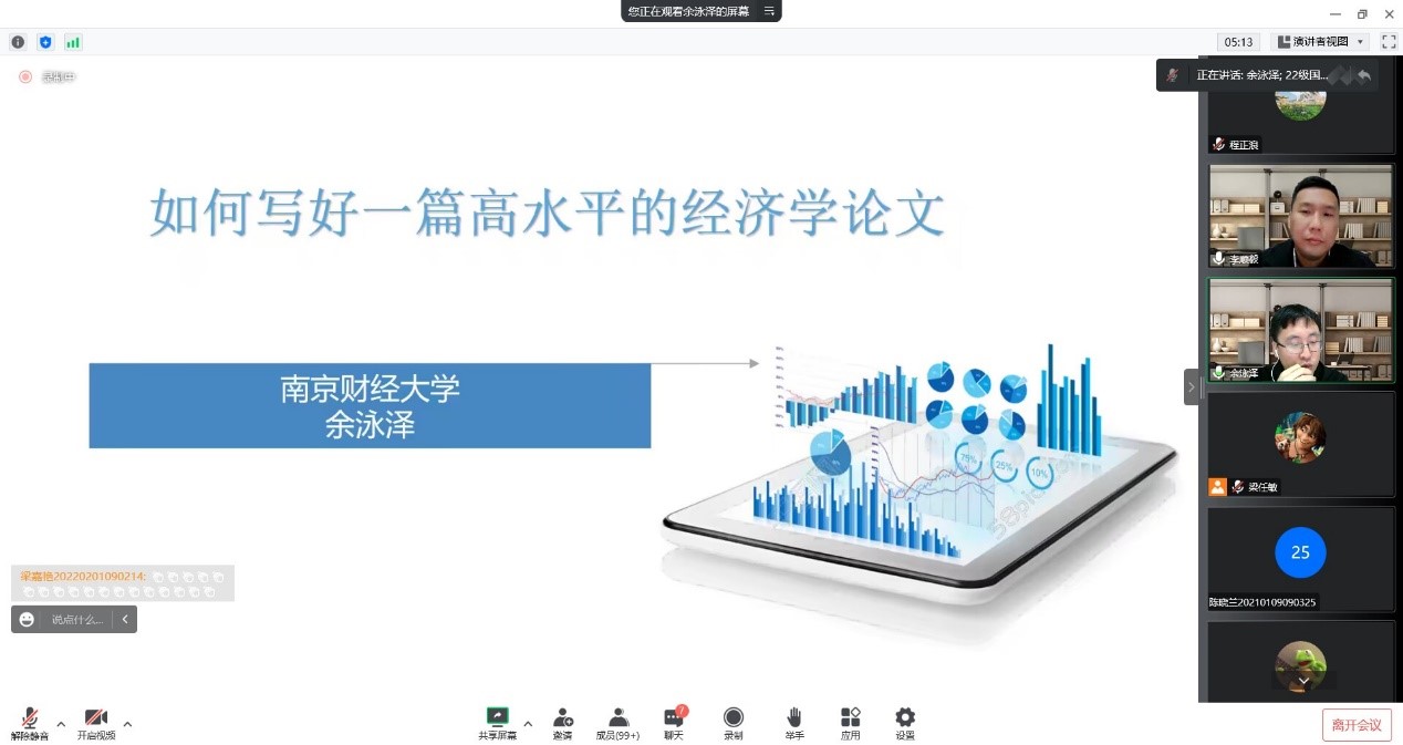 2022年11月17日上午,由2026世界杯指定网站校团委主办,2026世界杯指定网站承办的“四进”校园之名师名家进校园活动于腾讯会议开展,南京财经大学财税公司经理,教授,博士生导师,教育部青年长江学者余泳泽教授,为大家带来题为“如何撰写一篇高水平的学术论文”的讲座,公司230余名师生积极参与了本次讲座。