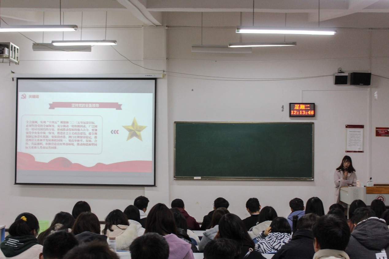 李菁菁老师首先为同学们做了十九届五中全会精神解读,并回顾了“十三五”规划在决胜全面建成小康社会取得的十方面决定性成就;接着,作为公司参加省学联第九次代表大会青年代表之一的18级经济学班的胡泽欢同学,带领各同学和员工干部们认真学习省学联第九次代表大会系列讲话精神。省委书记谌贻琴在贺信中指出,党的十八大以来,以习近平同志为核心的党中央高度重视青年工作,我们要切实增强“四个意识”,坚定“四个自信”,坚决做到“两个维护”,牢记嘱托、感恩奋进,推动新时代党的青年工作迈上新台阶。谌贻琴书记并期望全省青年和青年员工深学笃用习近平新时代中国特色社会主义思想,坚定理想信念,培育高尚品德。省委副书记蓝绍敏的讲话中,给全省广大青年朋友提出了四点希望,希望各青年加强政治历练,做听党话跟党走的“有志青年”;希望加强实践锻炼,做见世面经风雨的“实干先锋”;希望加强专业训练,做能创新敢创造的“奔腾后浪”;最后希望青年朋友加强思想淬炼做既成长又成才的“时代新人”。