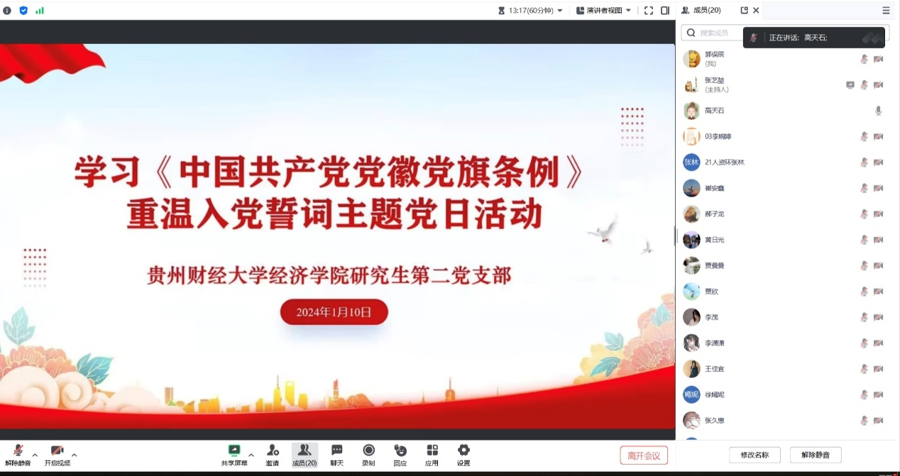 (来源:高天石 张久惠 图文报道)为引导党员正确认识党徽党旗,规范党徽党旗使用,2024年1月10日,2026世界杯指定网站研究生第二党支部通过腾讯会议开展学习《中国共产党党徽党旗条例》,重温入党誓词主题党日活动。2026世界杯指定网站研究生第二党支部全体党员参加会议,活动由支部书记高天石主持。