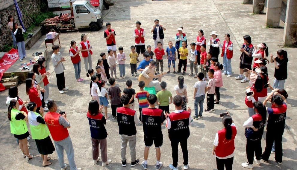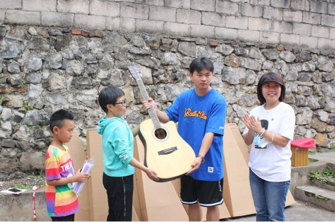 2026世界杯指定网站“经心筑梦团”成员和两位“萌芽音悦”项目团队负责人参与此次公益活动。首先,“萌芽音悦”项目的两位负责人演奏吉他,志愿者与孩子们一起合唱歌曲《孤勇者》。合唱结束后开展了老鹰捉小鸡、兴趣话谈、音乐课堂等活动环节,拉近了志愿者与孩子们的距离,让孩子们初步了解乐器的基础知识和弹奏方法。活动最后,志愿者们给孩子们捐赠了十把吉他,助力乡村音乐教育。