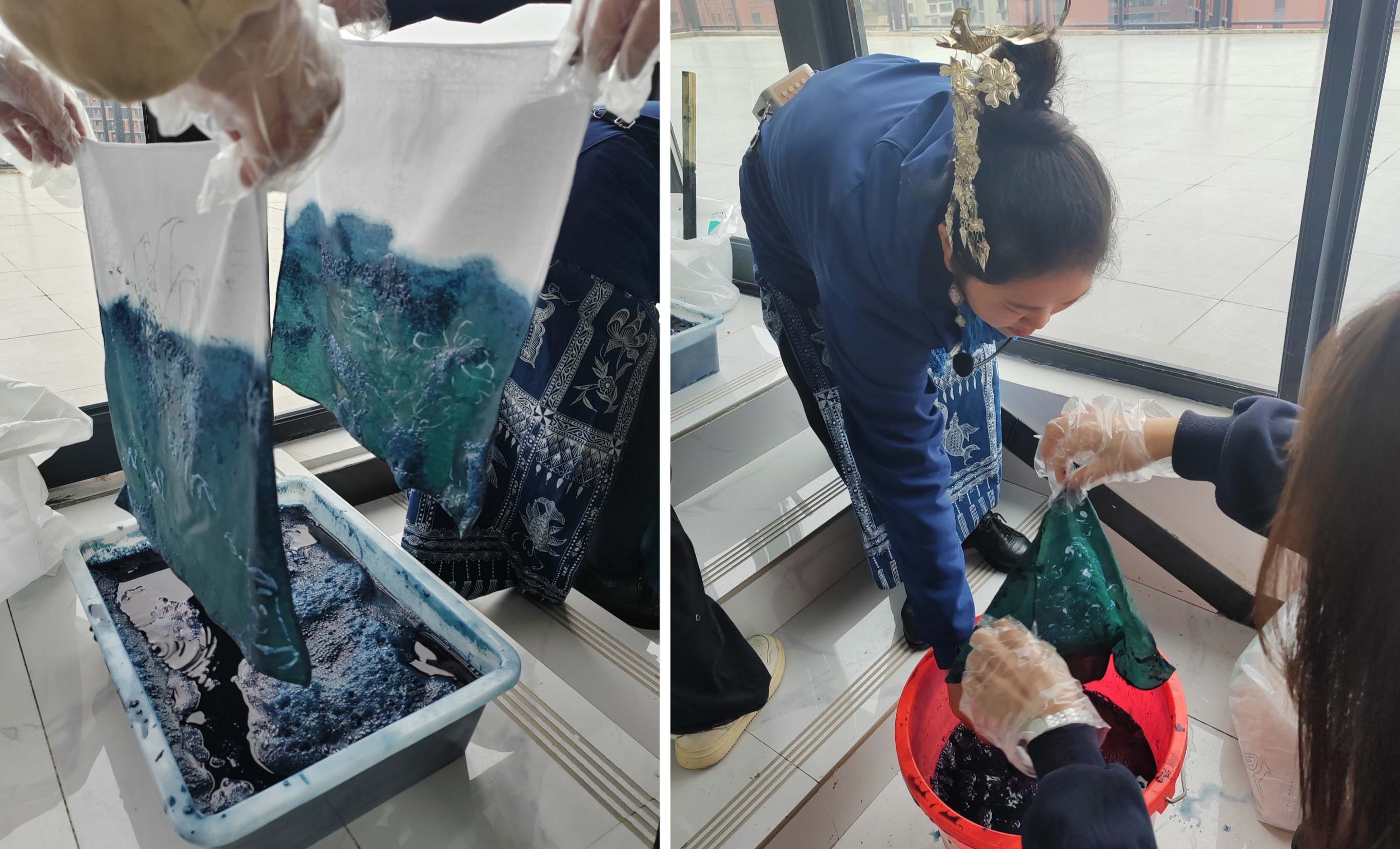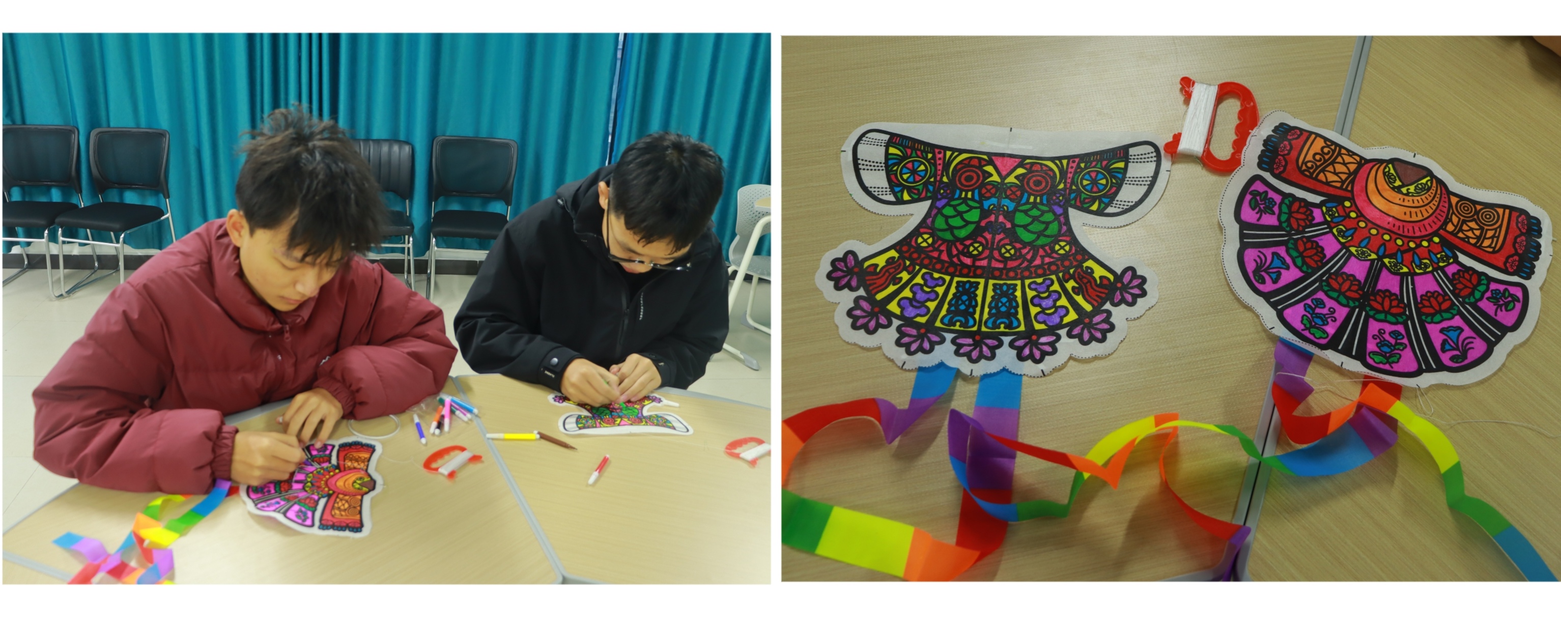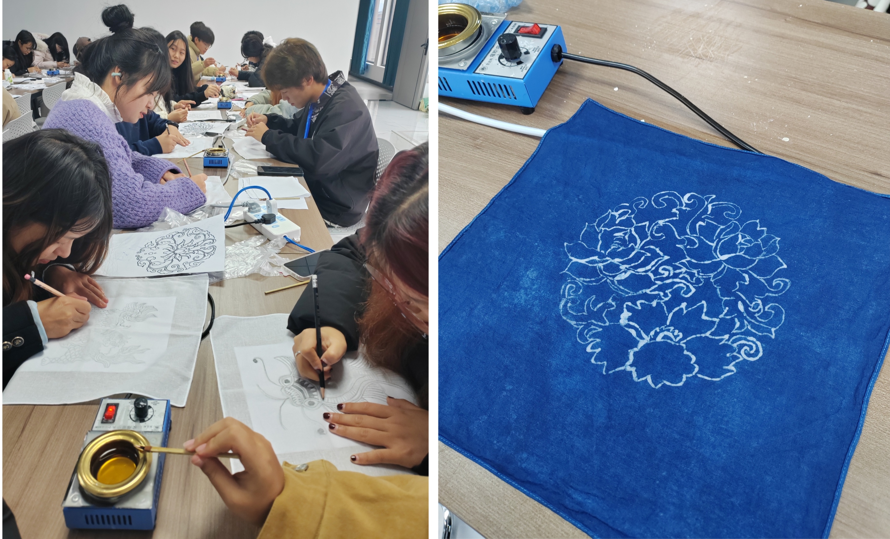 活动特邀郭双琴、汤昌乾、王琳俊三位非遗专家现场指导了蜡染、香牌、风筝的制作技艺。郭双琴老师是一名“锦绣计划”设计师,在她的指导下,同学们用蜡刀蘸蜡液在白布上勾勒图案,让传统防染技艺在指尖流转;汤昌乾是国家级体验式教学讲师,她以蜂蜡为材,带领同学们将蜂蜡与各种香料巧妙融合,经过精心调配、塑形,一块块散发着独特香气且蕴含文化韵味的香牌逐渐成型,让大家深切领略到传统香牌文化的精致与魅力;有着10年设计工作经验的王琳俊老师负责风筝制作教学。同学们细心绘制图案,制作出一个个创意十足的风筝,制作过程中,同学们相互协作交流,现场气氛热烈非凡。