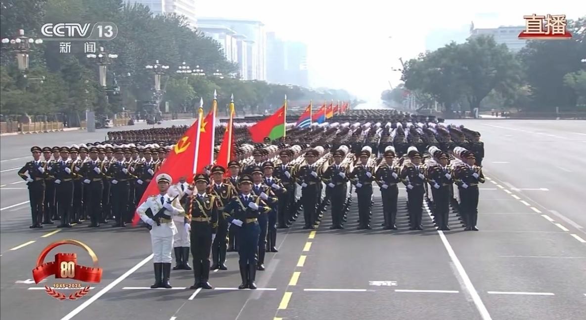 9点,阅兵直播正式开始,全体团员起立,奏唱国歌,庄严的国歌声响彻整个文澜楼。看见受阅部队以“威武雄壮的强大阵容、昂扬奋进的崭新风貌、一往无前的磅礴气势”展现在世人面前,会场多次爆发出热烈的掌声。尤其是当空中护旗梯队划破长空、徒步方队步伐铿锵、战旗方队旗帜通过天安门城楼时,师生们的民族自豪感油然而生。当先进装备闪耀着科技的光芒震撼出场,现场气氛达到了高潮,同学们共同鼓掌,轻声欢呼,表达着内心的激动与自豪。