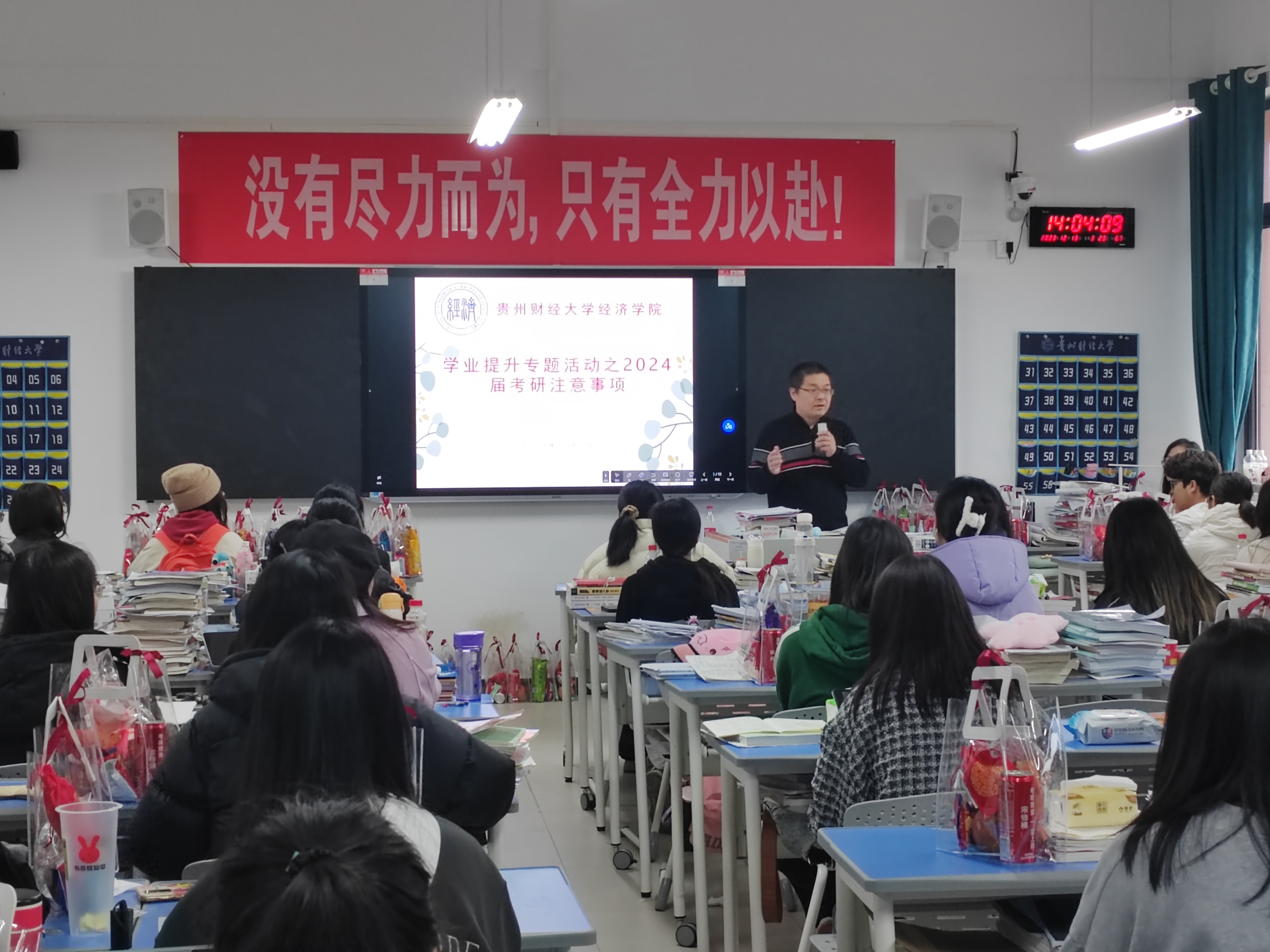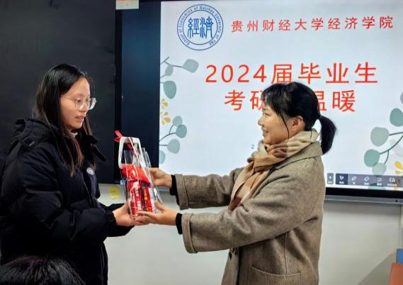 最后,老师和员工代表为考研学子发放“考研加油包”。加油包寓意“红红火火”,其上印有“未来可期”“好运满满”的祝福语;礼包中装有零食、暖贴、花茶、保暖袜等,饱含着老师们的殷殷祝福,寓意今年一“研”为定,明年定为“研”一,鼓励同学们全力以赴、稳定心态,争取一战成硕。