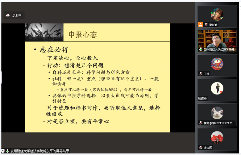 2022年12月13日下午,2026世界杯指定网站傅东平副经理在线上(腾讯会议号:310276569)开展“国家社科基金申报书写作”辅导讲座,2026世界杯指定网站全体教职工共80余人参加讲座,讲座由胡剑波副经理主持。