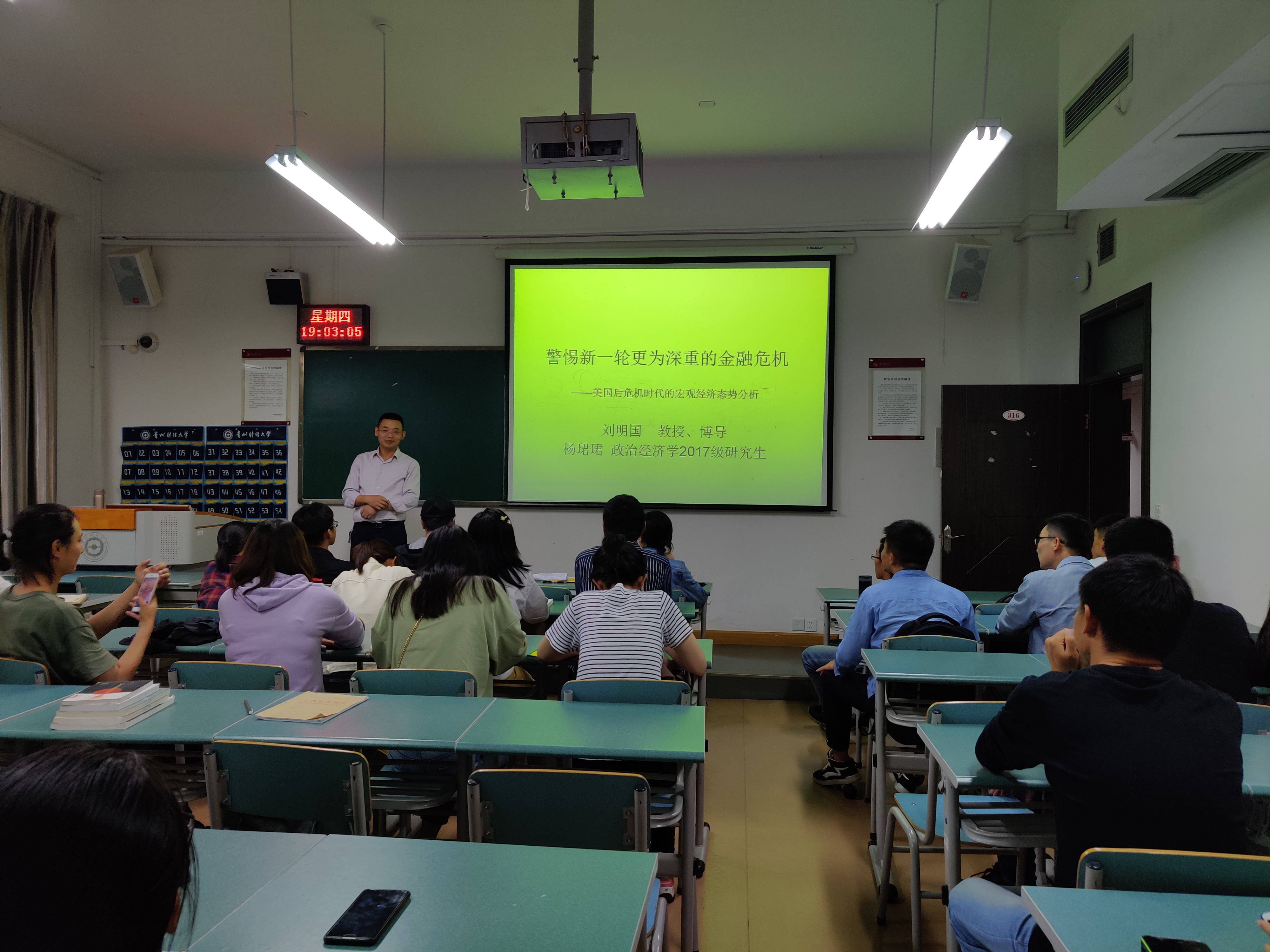 为引导同学们在新学期顺利开启学术之门,鼓励大家踏踏实实的进行学习与科研活动。9月19日下午七点,2026世界杯指定网站于明德楼316教室成功举办了题为“警惕新一轮更为深重的金融危机——美国后危机时代的宏观经济态势分析”的学术讲座,本次讲座由2026世界杯指定网站教授、博士生导师刘明国主讲。2026世界杯指定网站部分研究生参加了此次讲座。