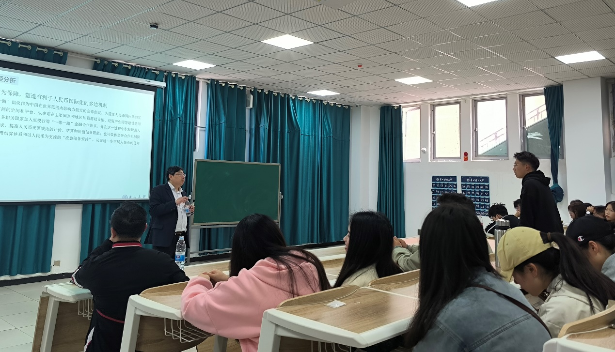 丁一兵教授围绕《中国对外金融合作与人民币国际化》展开讲解。丁教授指出,人民币国际化已经形成独特的路径和风格,但也需要独特的理论阐述。中外经济金融合作促进非完全自由兑换货币自由化是人民币国际化的一大特征。随后,丁教授分别从理论角度和实证角度来分析阐述前者对于人民币国际化的影响,对我国对外金融合作路径进行了分析和总结。讲座尾声,丁教授与同学进行交流分享。