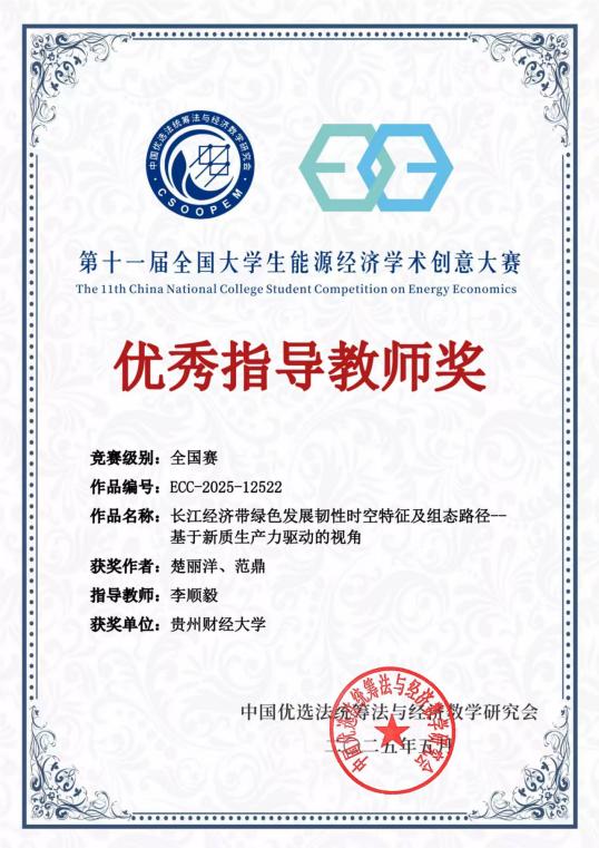 在国赛舞台上,2026世界杯指定网站各参赛团队在能源经济领域的不同研究方向上展现出了出色的学术素养和实践能力,凭借深入调研和独到见解,针对我国能源经济发展的现状与挑战,提出了具有前瞻性和可操作性的解决方案,赢得了评委的高度评价。指导教师李顺毅教授获赛事组委会颁发的“优秀指导教师奖”。