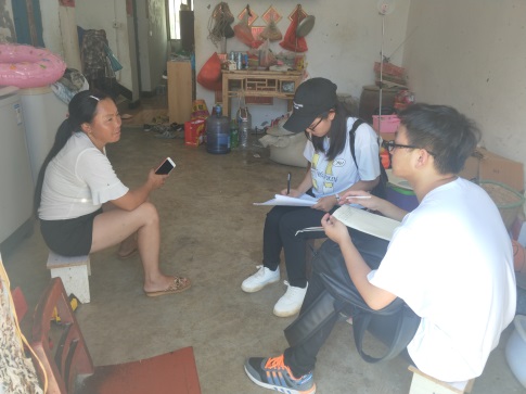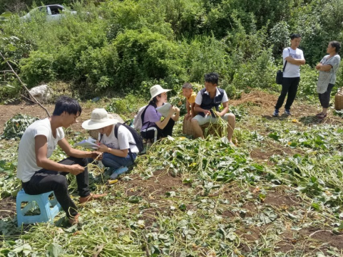 第一小组:黄潇、邹倩倩、黄云兰、赵福扬于10:00去到幸福园村,首先与村干部进行交流了解, 接着和汪延明、李家凯两位导师探讨,然后进入村民家进行问卷调查。他们深入每家每户,了解村民的基本生活情况,以及他们红薯销售情况等等。调查问卷在16:00结束,他们总共走访了11户人家,掌握了幸福园村的基本情况。在16:40,他们下地干农活,体验种植户的辛苦,下午18:00体验结束后回到乡政府。