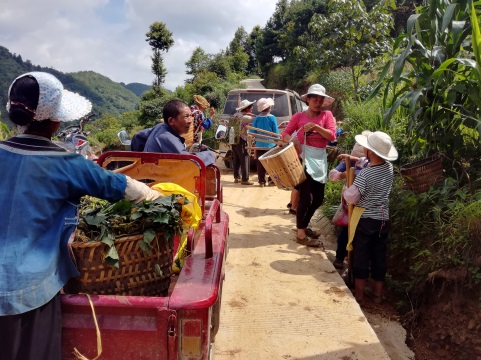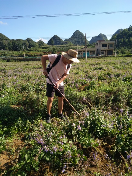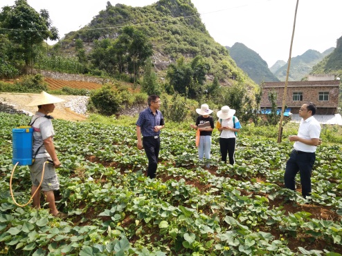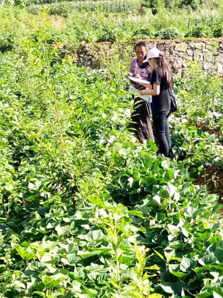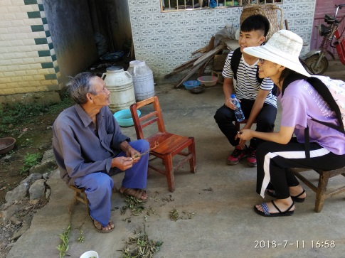 第二小组:潘小醒、韦国佳、王艳于9:00到岩上村。10:00看望孤寡老人、留守儿童、老党员; 给孩子们发放漫画。11:00下地调查红薯情况,体验农民生活。15:00到达幸福园,走访民户调查红心红薯情况。