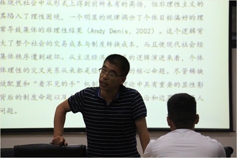 讲座伊始,汪教授介绍了本次讲座的初衷以及对研究生论文指导的整体规划。随后以幽默的语调提出本次讲座的主题——农业产业园区双重理性困境。并以PPT的形式从理性困境及其例证以及对理性困境现代视角分析提出农业园区理性困境的分析框架并给出理论模型架构。汪教授凭借长时间在外的实地调查,详细地为同学们讲述了农业产业园区发展概况与相应理论框架。最后展现其通过变量设计和数据分析所得出的结论并提出了自己的建议:研究生的论文应从自身实际出发,切忌生搬硬套。同时,汪教授认为作为研究生要把握好学习机会,夯实理论基础,并尽量多地去阅读文献。