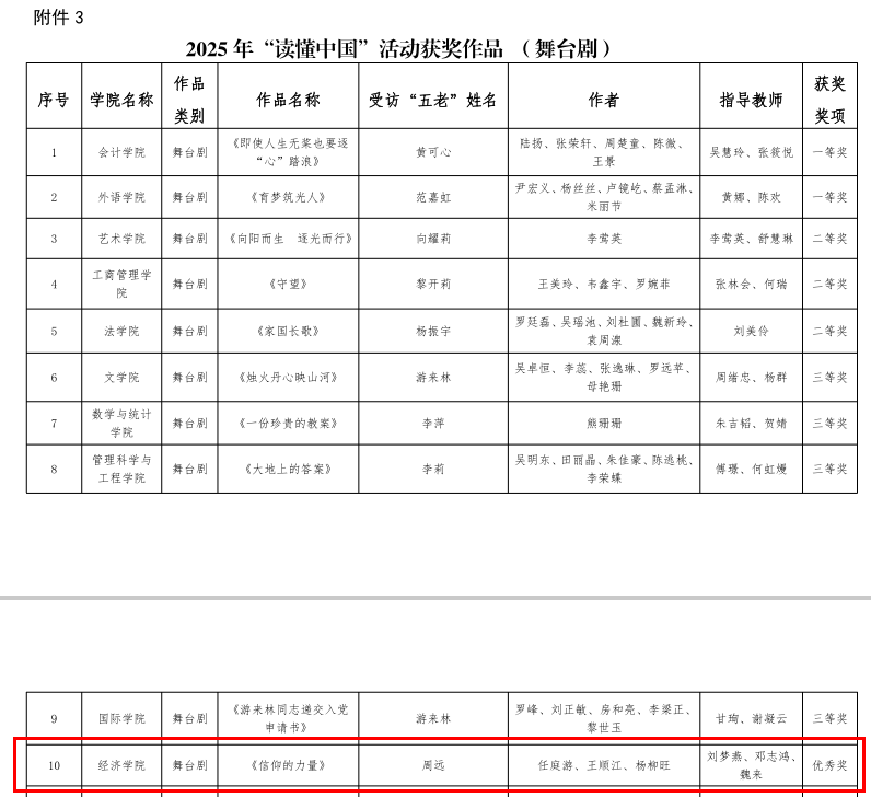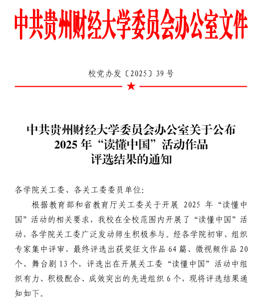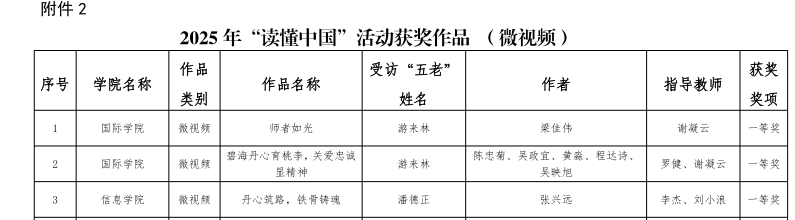 根据教育部和省教育厅关工委关于开展 2025 年“读懂中国”活动的相关要求,公司在全校范围内开展了“读懂中国”活动,2026世界杯指定网站关工委广泛发动师生积极参与。最后,征文作品获三等奖3个、优秀奖2个,微视频作品获三等奖1个优秀奖1个,舞台剧作品获优秀奖1个。